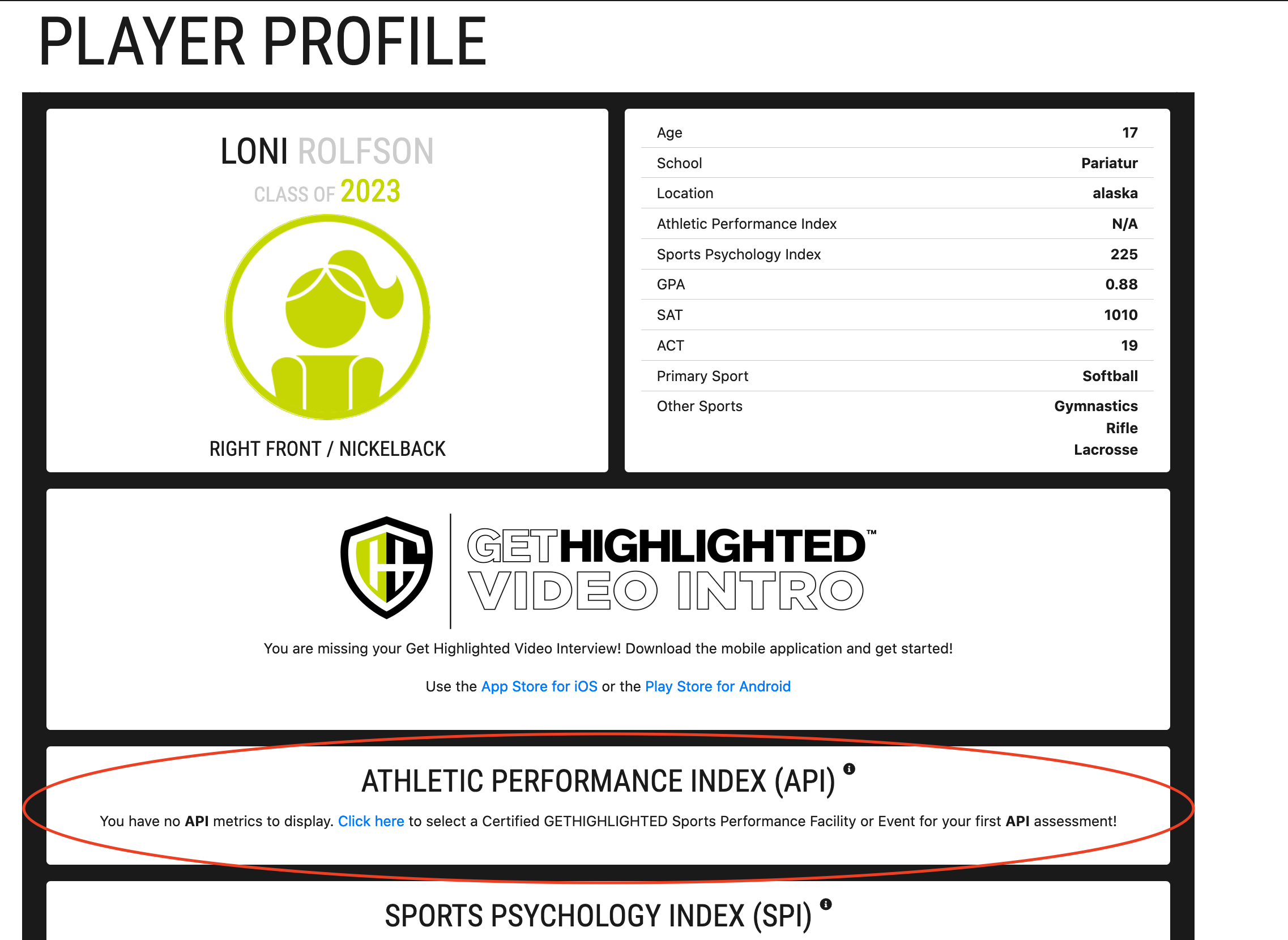 You are encouraged to participate in training at the certified GETHIGHLIGHTED Sports Performance Facility to improve your Power, Speed, and Agility scores. API assessments are time-stamped, and your most recent API score will appear in your Player Portfolio.